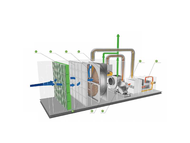 經(jīng)預處理(去除粉塵、顆粒物)后的有機廢氣流過濃縮轉(zhuǎn)輪時,其中的有機物在轉(zhuǎn)輪吸附區(qū)域會被吸附下來,經(jīng)過吸附凈化后的廢氣(約占處理風量的85% 95%)排放到大氣中,一小部分廢氣(約占處理風量的5%~15%)對轉(zhuǎn)輪冷卻區(qū)降溫后經(jīng)換熱器被加熱到180 220℃的脫附溫度后,流入脫附區(qū),脫附區(qū)有機物從吸附劑一沸石上脫離到加熱的氣流中,轉(zhuǎn)輪得以再生,脫附后的高濃度VOCs被送入CO催化燃燒。